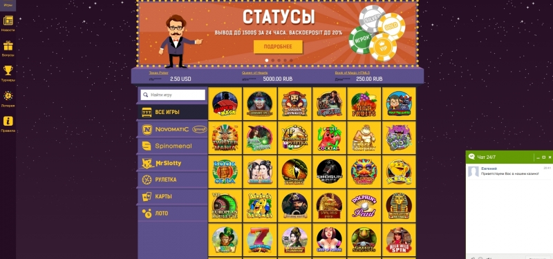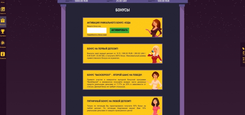 🎁 На игровом портале также действуют бонусы, где клиенту возвращают проценты от проигранных ставок. Эти акции называются «Бэк Депозит» и «Пятничный бонус». Подробности поощрений описаны в разделе «Бонусы».