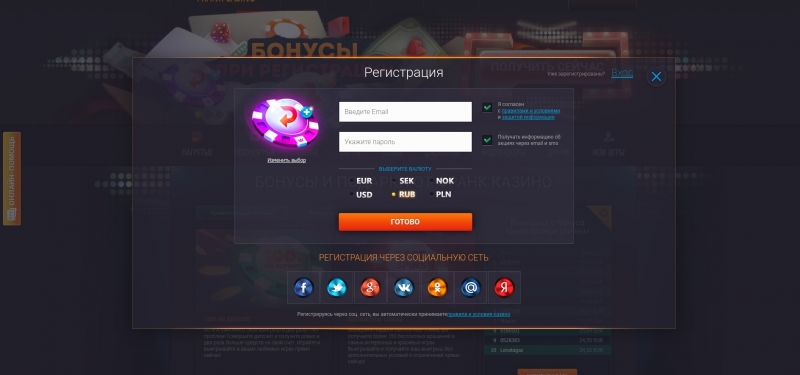После этого зарегистрированный клиент участвует в играх на деньги и турнирах. Если у пользователя есть аккаунт в социальных сетях, то он регистрируется, кликнув нужную иконку, для этого на портале есть 7 значков. Потребуется несколько секунд для автоматической регистрации через социальные сети: Фейсбук, Гугл + и прочие.