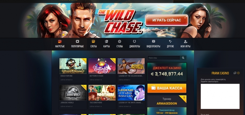 💰 В чате постоянно находится онлайн служба, которая помогает посетителям. Если Казино Франк перестал работать смело обращайтесь в чат или вайбер саппорта, также для связи на главной странице указан телефон и контакты Франк Казино.