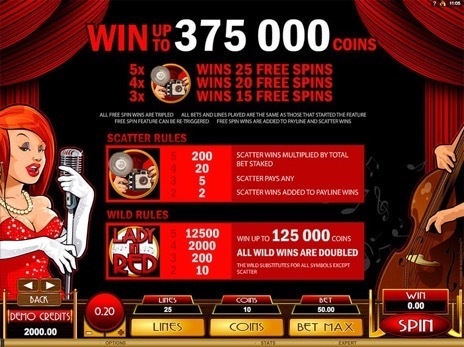 Протестировать видео слот «Леди в красном» можно совершенно бесплатно. Демо Версия автомата позволяет пользователям играть на кредитные средства. Новичку предоставляются 3000 кредитных единиц для ставок и запуска игровых барабанов.