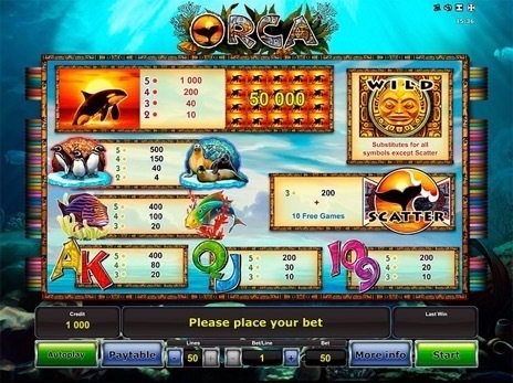 Видео слот Orca – это традиционный пяти барабанный игровой аппарат. Оплачиваемые цепочки собираются на 50 полосах. Активные полосы можно изменять по усмотрению клиента.