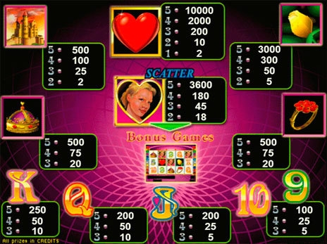 В игре активное участие принимают иконки с королевой, королевской короной, старинным и могучим палацем, красным сердцем, кольцом и цветами. Немаловажными становятся игральные карты.