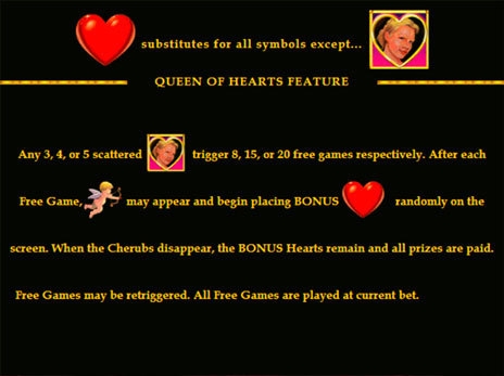 Бонусные игры в игровом автомате Queen of Hearts не предусмотрены. Бонусная политика ограничивается фри спинами.