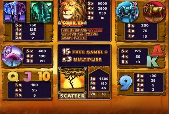 Среди большого количества обычных символов (носороги, фламинго, зебры, жирафы, слоны, быки, игральные карты) есть и довольно интересный и полезный Wild символ с изображением льва, короля саванны. Этот символ заменяет собой любой другой (кроме символа Scatter) в выпавших комбинациях. Приятным моментом является и то, что дикий символ увеличивает выигрыш в 2 раза. Когда он выпадает в комбинации, то становится анимированным. Также полезным в игре является символ разброса – изображение дерева. Когда на игровом поле выпадают 3 и более таких символов, то запускается серия фри спинов. При этом выигрыш возрастает в 3 раза.